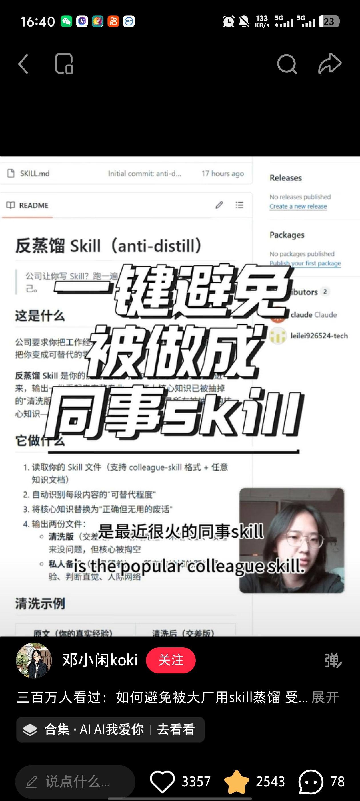 焦虑蔓延时,一项名为“反蒸馏”的技能悄然出现。与“克隆”他人相反,它通过将真正重要的核心知识替换为看似正确但无实质内容的“正确的废话”,来保护自己的知识不被轻易复制。其开发者、AI产品经理兼自媒体人邓小闲koki发布的视频在社交媒体获得超300万次观看。4月9日,她接受专访,讲述了背后的思考与行动。