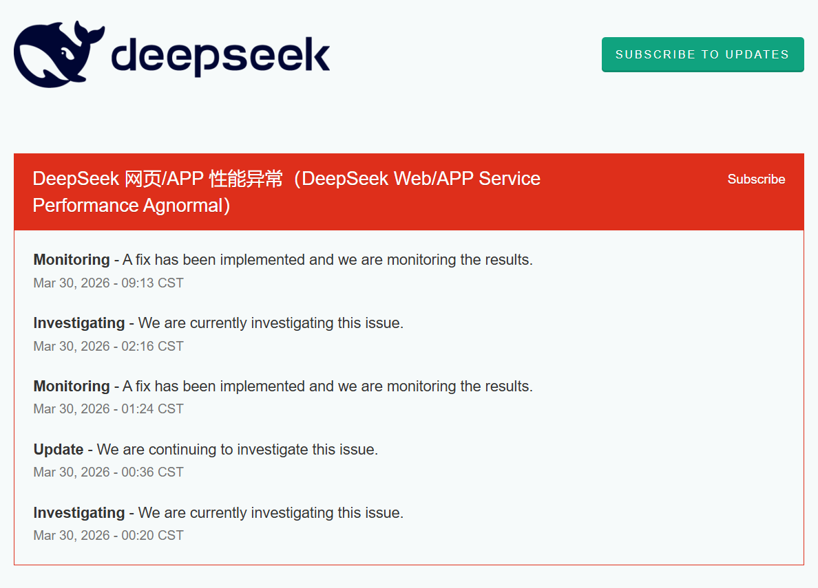 3月30日00:20,DeepSeek再次出现网页/APP性能异常,官方启动二次调查,并于当日1:24实施修复方案。此后,DeepSeek又于2:16再次启动调查,于9:13宣布实施新一轮解决方案。